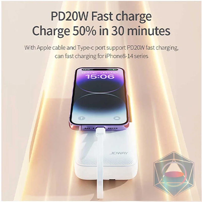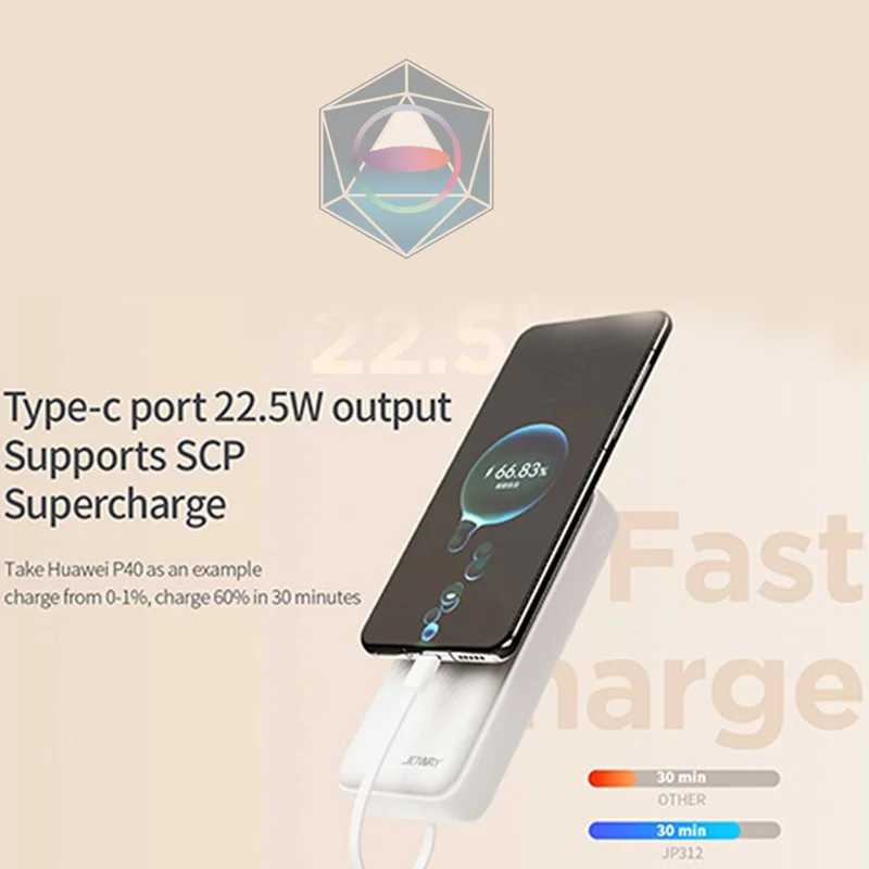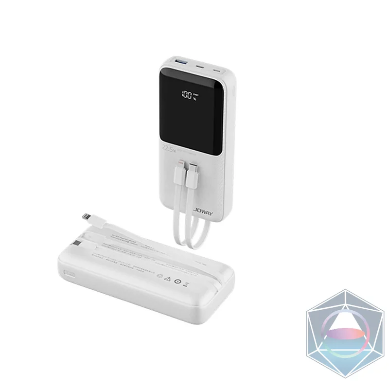 پاوربانک جووی مدل JP312 ظرفیت 20000 میلی آمپرساعت دارای 2 کابل سرخود که در جای مخصوص روی بدنه پاوربانک طراحی شده جام میگیرم و مشکل حمل کابل جداگانه را برطرف کرده.شارژ pd 22.5 واتی از مزیت های این پاوربانک به حساب میاید.صفحه نمایشگر LEDکه درصد شارژ پاوربانک را نشان میذهد از دیگر مزیت های این کالا میباشد.