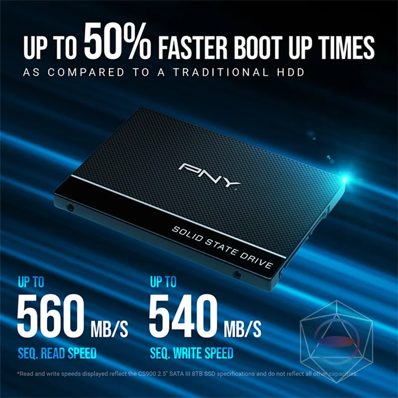 حافظهی اس اس دی «CS900» محصولی از شرکت «پی ان وای» (PNY) است. این اس اس دی در ظرفیت 120 گیگابایت ارائه شده و با استفاده از رابط SATA 3 به مادربرد کامپیوتر متصل میشود. فرم فاکتور این حافظه 2.5 اینچ است که میتوان آن را در کیسهای کامپیوتر دسکتاپ و لپتاپها نصب کرد. سرعت خواندن اطلاعات به صورت ترتیبی در این حافظه تا 515 مگابایت بر ثانیه و سرعت نوشتن ترتیبی در آن به 490 مگابایت بر ثانیه میرسد. این سرعت، تقریبا 10 برابر حداکثر سرعتی است که در هاردیسکهای 7200 دور بر دقیقه قابل دستیابی است. حافظههای اس اس دی برخلاف هارددیسکها، فاقد قطعه مکانیکی برای ذخیرهسازی اطلاعات است. همین امر باعث میشود که بتواند در برابر انواع صدمات مانند ضربه، لرزش و شوک مقاومت نسبتاً بسیار خوبی نشان دهند. اس اس دیها گزینهای بسیار عالی برای تجربهی امنیت و سرعت حداکثری هستند. شرکتهای زیادی به طراحی و تولید حافظههای ذخیرهسازی اطلاعات میپردازند که پی ان وای یکی از آنهاست. مدل CS900 از حافظههای TLC 3D NAND استفاده میکند و حافظهای سریع به حساب میآید.